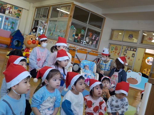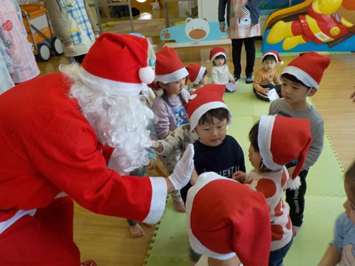 12/22 こどもたちの写真 未満さんクリスマスパーティーでした こどもたちの写真 サンタさんとタッチしたよ こどもたちの写真 園長先生がギターを演奏してくれました こどもたちの写真 クリスマスプレゼントありがとう