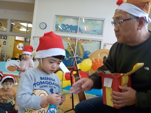 12/22 こどもたちの写真 未満さんクリスマスパーティーでした こどもたちの写真 サンタさんとタッチしたよ こどもたちの写真 園長先生がギターを演奏してくれました こどもたちの写真 クリスマスプレゼントありがとう