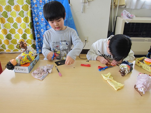 2/17 こどもたちの写真 ひなまつり製作 こどもたちの写真 もうすぐ完成 こどもたちの写真 髪の毛と飾りを作ったよ こどもたちの写真 おひなさま箱から出してるね こどもたちの写真 おひな様の体作り こどもたちの写真 丸くなーれ